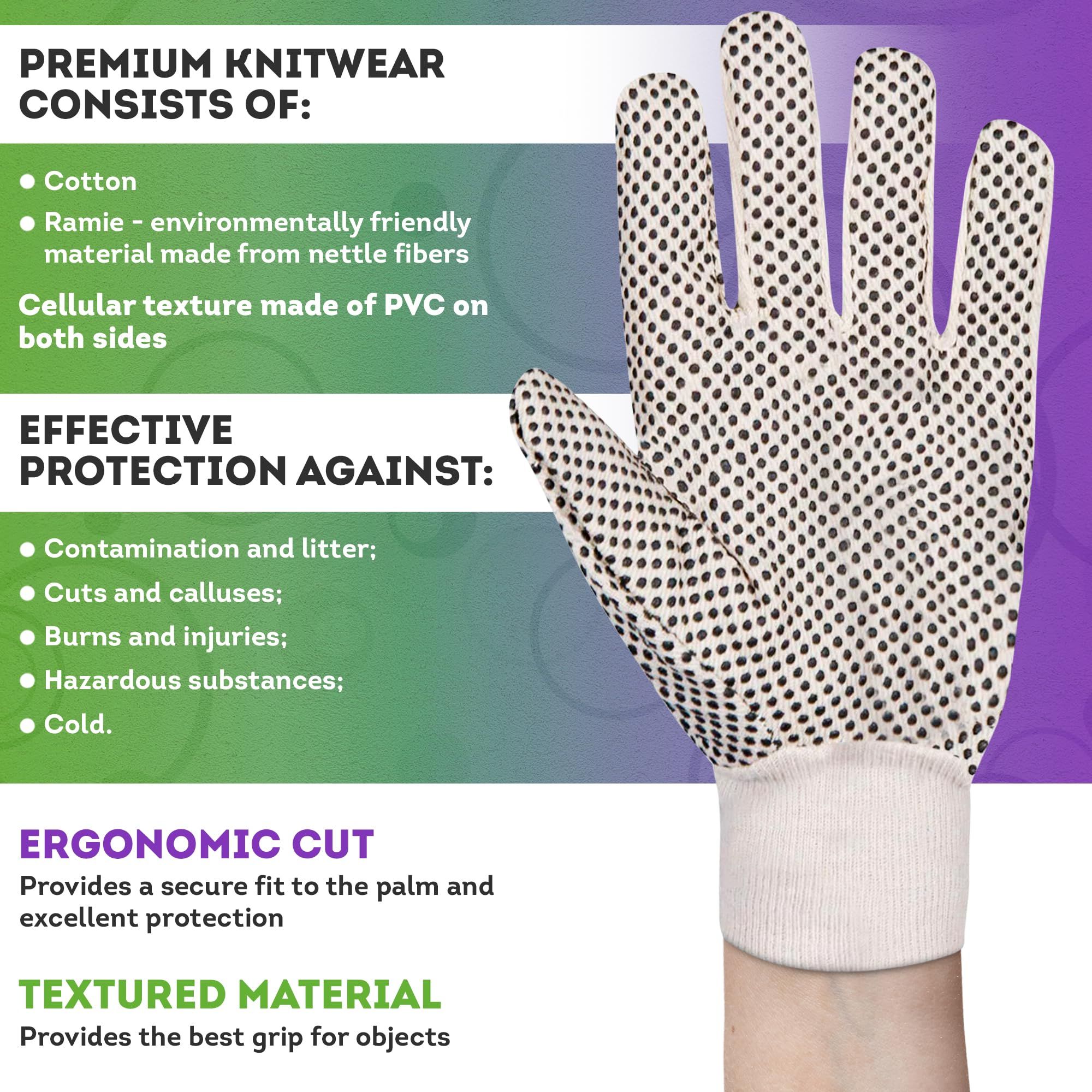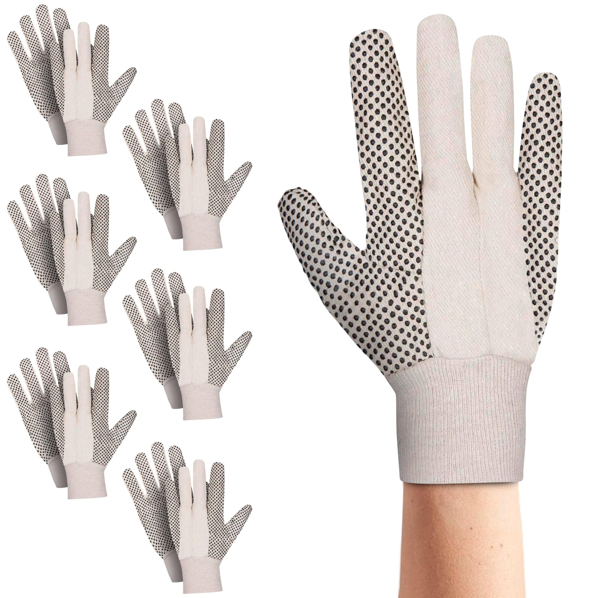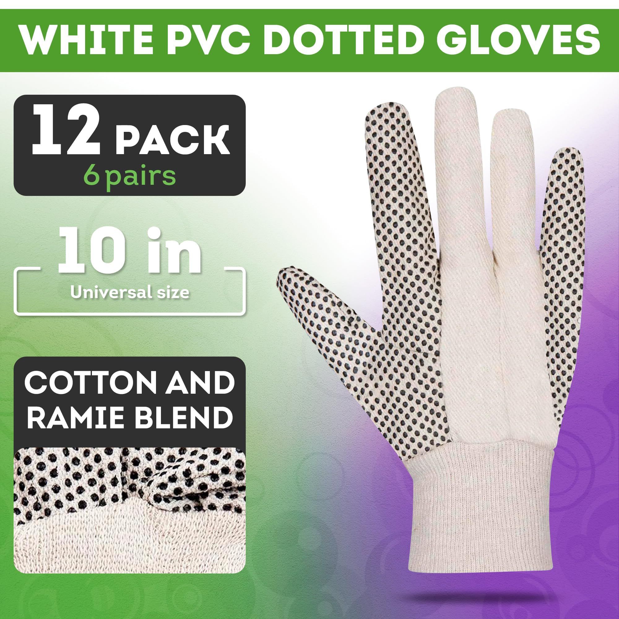 1.Pack of 12 Canvas Work Gloves, 10 Inch. 6 pairs of canvas/ramie cloth gloves are comfortable and all-purpose equipment. 12 pcs of reusable large size canvas cloth gloves provide general indoor and outdoor protection. PVC dots of warehouse gloves are on the palms, thumb, index and little fingers on the back side.